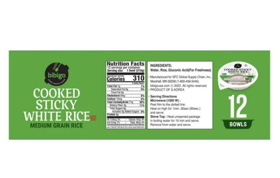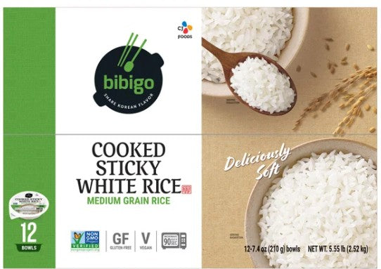 - Twelve microwavable 7.4 oz bowl of bibigo Korean Style Cooked Sticky White Rice