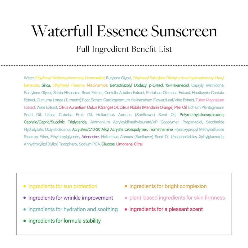 Water, Ethylhexyl Methoxycinnamate, Homosalate, Butylene Glycol, Ethylhexyl Salicylate, Diethylamino Hydroxybenzoyl Hexyl Benzoate, Silica, Ethylhexyl Triazone, Niacinamide, Benzotriazolyl Dodecyl p-Cresol, 1,2-Hexanediol, Caprylyl Methicone, Pentylene Glycol, Salvia Hispanica Seed Extract, Centella Asiatica Extract, Portulaca Oleracea Extract, Houttuynia Cordata Extract, Curcuma Longa (Turmeric) Root Extract, Cardiospermum Halicacabum Flower/Leaf/Vine Extract, Tuber Magnatum Extract, Wine Extract, Citrus Aurantium Dulcis (Orange) Oil, Citrus Nobilis (Mandarin Orange) Peel Oil, Echium Plantagineum Seed Oil, Litsea Cubeba Fruit Oil, Helianthus Annuus (Sunflower) Seed Oil, Polymethylsilsesquioxane, Caprylic/Capric/Succinic Triglyceride, Ammonium Acryloyldimethyltaurate/VP Copolymer, Propanediol, Saccharide Hydrolysate, Octyldodecanol, Acrylates/C10-30 Alkyl Acrylate Crosspolymer, Tromethamine, Hydroxypropyl Methylcellulose Stearoxy Ether, Ethylhexylglycerin, Adenosine, Helianthus Annuus (Sunflower) Seed Oil Unsaponifiables, Xylitylglucoside, Anhydroxylitol, Xylitol, Tocopherol, Sodium PCA, Glucose, Limonene, Citral