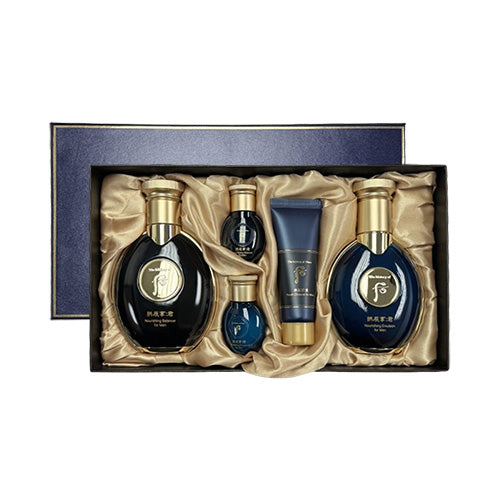 A set that includes the full size and deluxe sample sizes of the highly moisturizing Gongjinhyang Gun Nourishing Balancer and Emulsion for men; and a travel size of the foam cleanser.