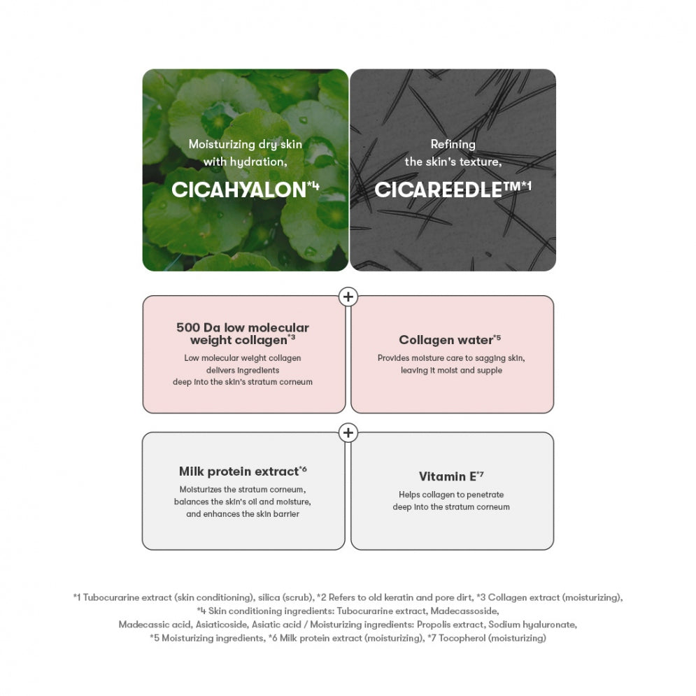 - CICA REEDLET™: Comprised of natural micro-needles that enhance the absorption of active ingredients while refining rough skin texture.
